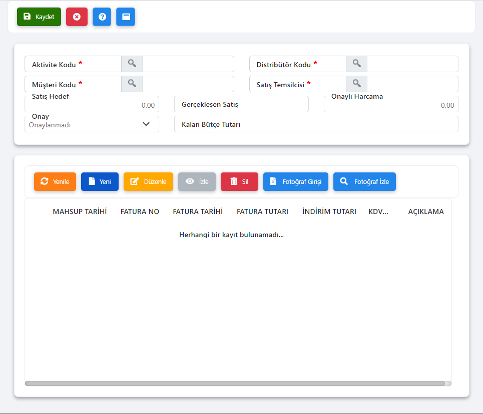 Menü Adımı :Satış ve Pazarlama Kriterleri 🡪Fon ve Bütçe Yönetimi🡪İşlemler🡪 Aktivite Fatura Girişi
