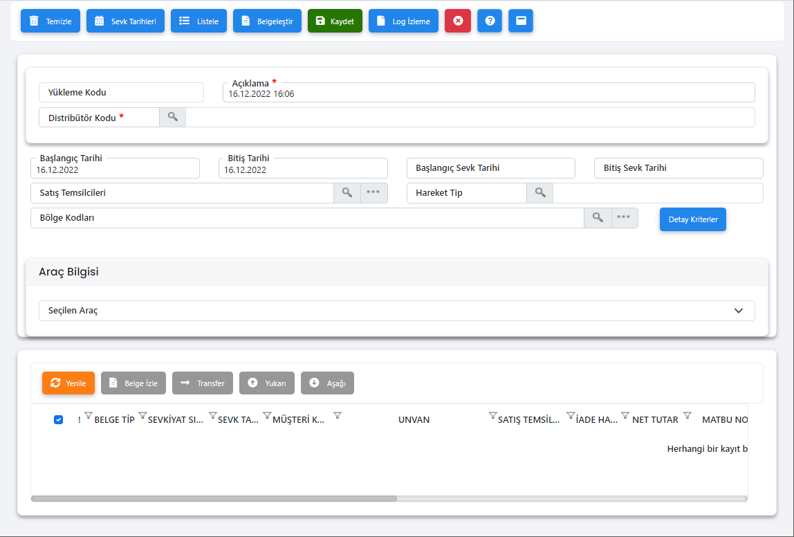 Listelenen siparişlerin istenilen yere transfer işlemi gerçekleştirilir. |