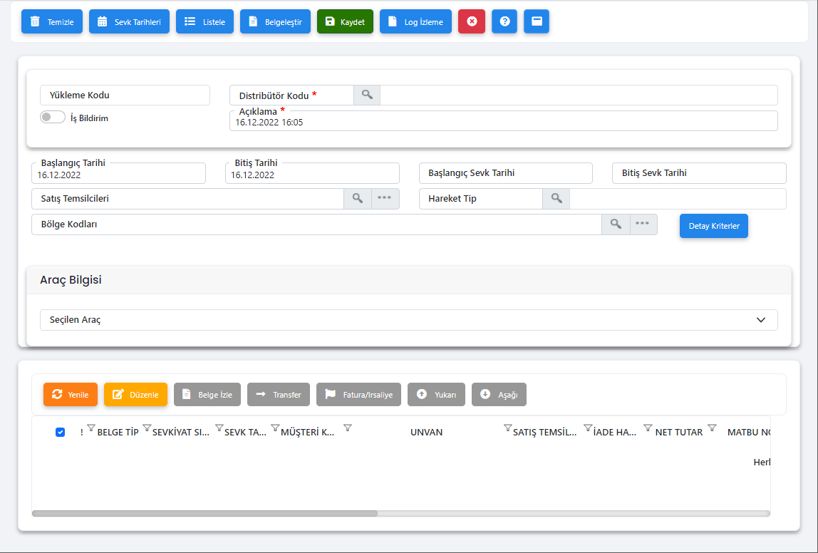 Ekran Tanımı : Distribütörün ürün alımı yaptığı firma veya genel merkezinden talep etmiş olduğu siparişlerinin(bozuk) irsaliyeleştiği ya da faturalandığı ekrandır.