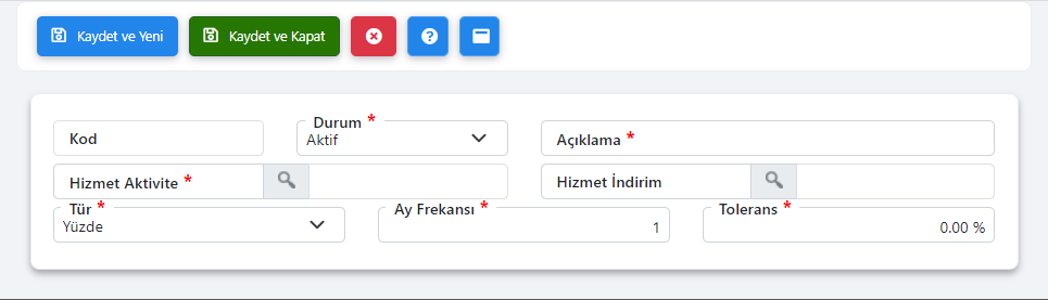 Müşterilerden geri dönüş faturalarında kullanılacak hizmet kaleminin tanımlandığı ekrandır. Hizmet kalemi faturaya otomatik olarak gelir. |