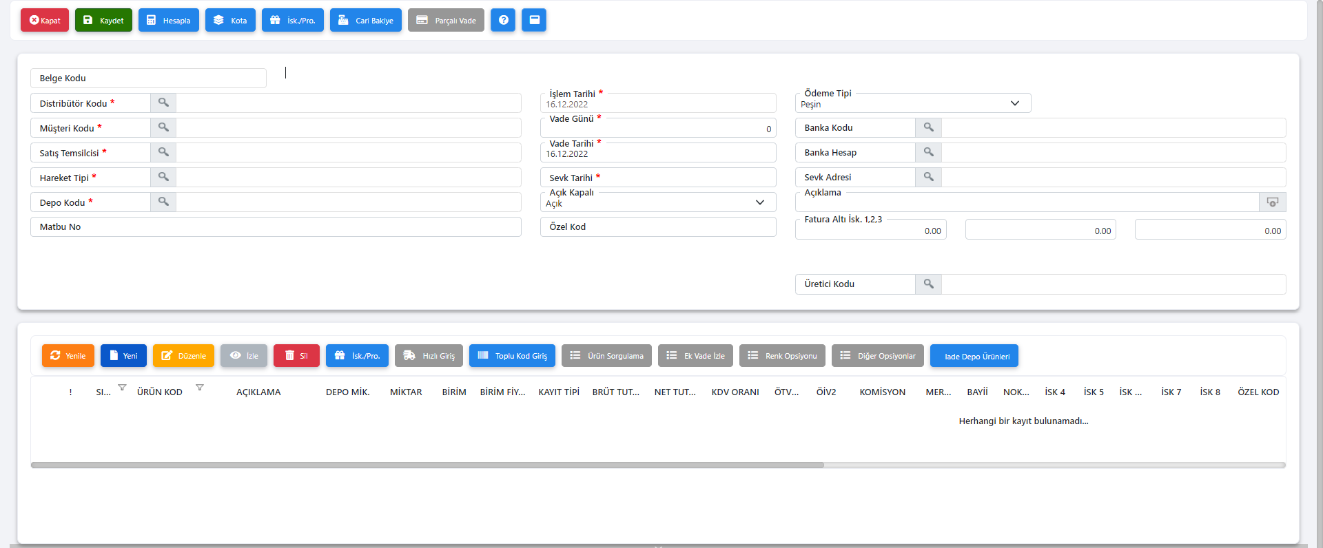 Sevkiyat deposunun seçildiği alandır. Default olarak distribütörün varsayılan deposu gelir fakat değiştirilebilir. Zorunlu bir alandır. |