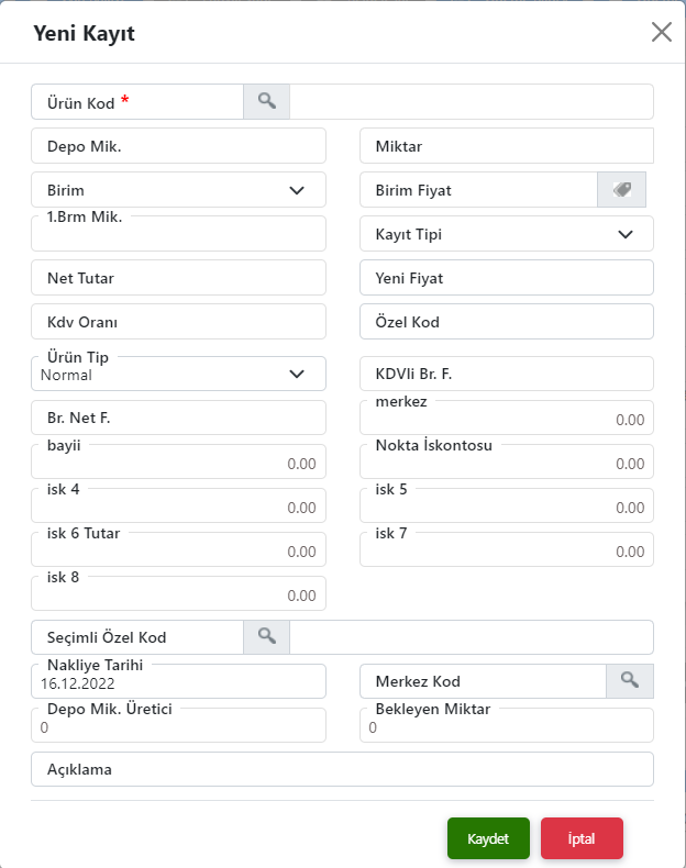 Default değeri 0 'dır. İlgili ürünün belge detayına eklenmesini istiyorsak miktar değeri girilmelidir. |