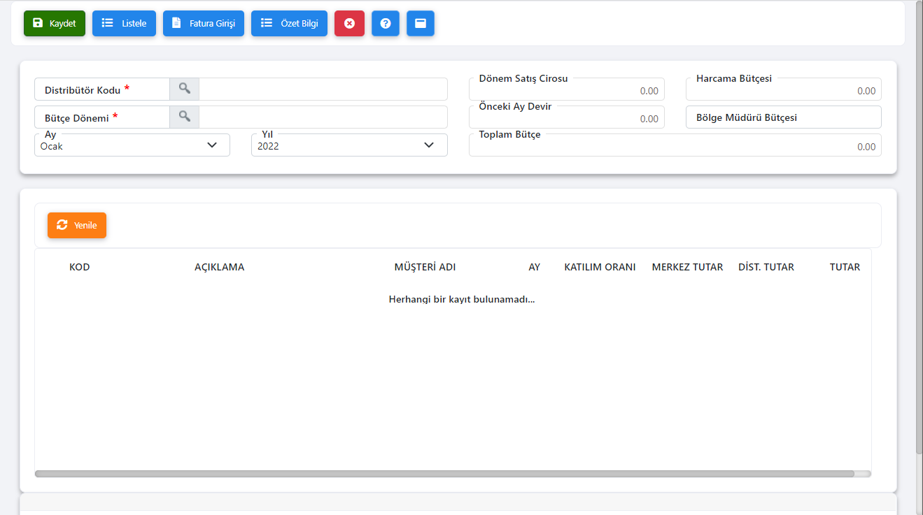 Ekran Tanımı : Distribütör harcama bildirim ekrandır.