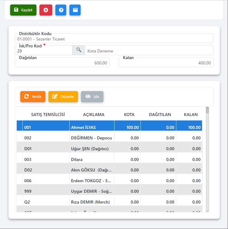 Listelenen Satış Temsilcisi kayıtlarından seçilen kayıt düzenle ile açılır ve dağıtılacak kota miktarı girilir. Buna göre formun başlık kısmında bulunan Dağıtılan ve Kalan alanları kaydetme işlemi sonrası revize olur. |