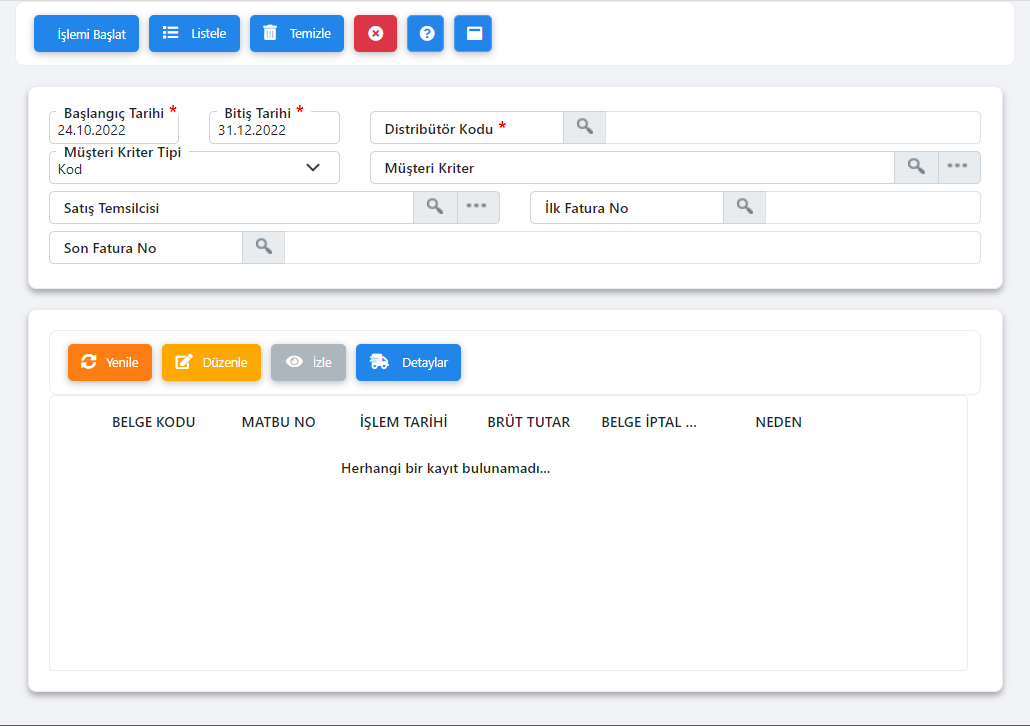 Distribütör kodu bilgisine göre iptal edilen faturaları listeler. |