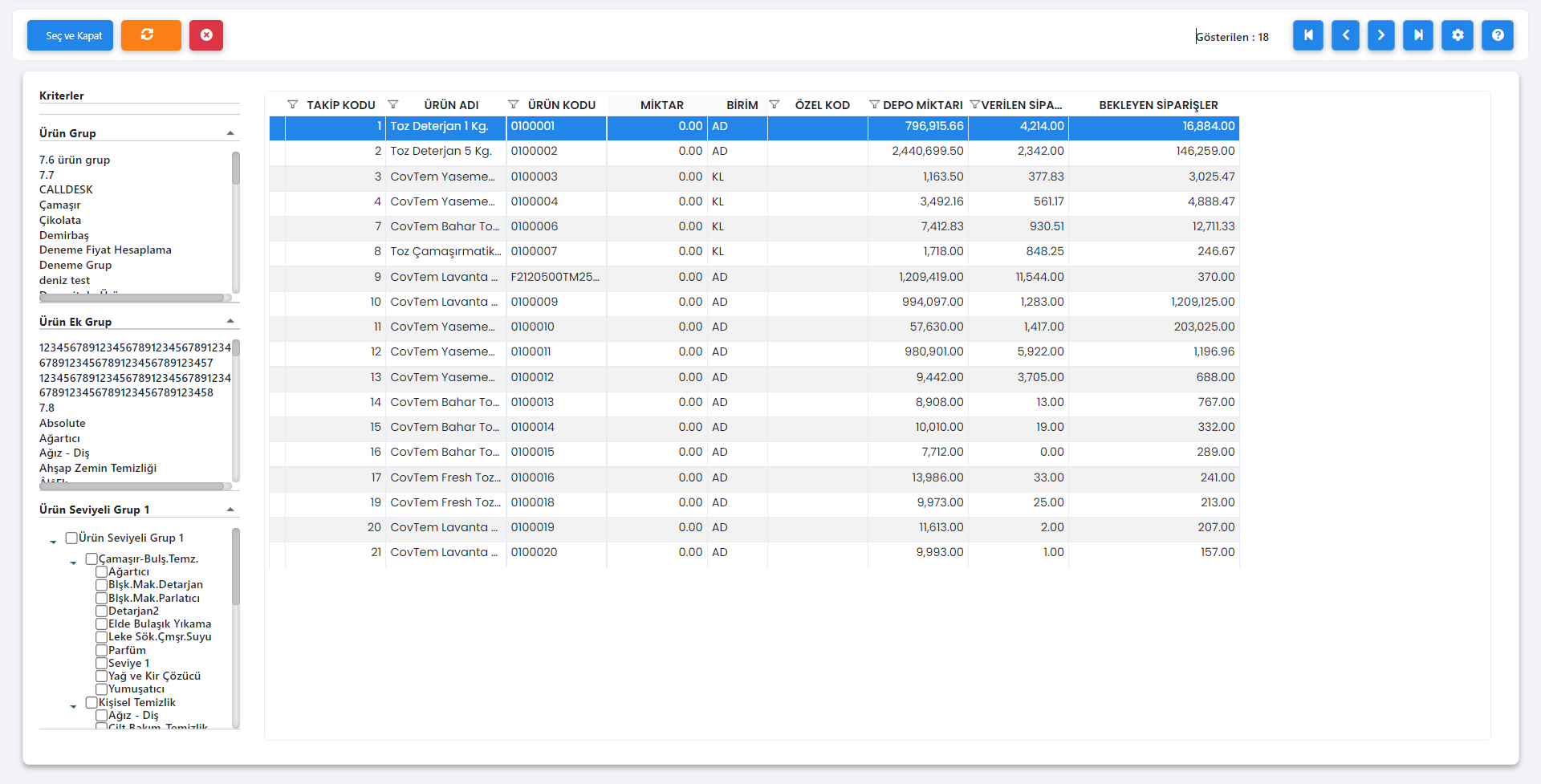 Listelenen ürünlerin belgedeki depoya ait miktar değerini gösterir. |