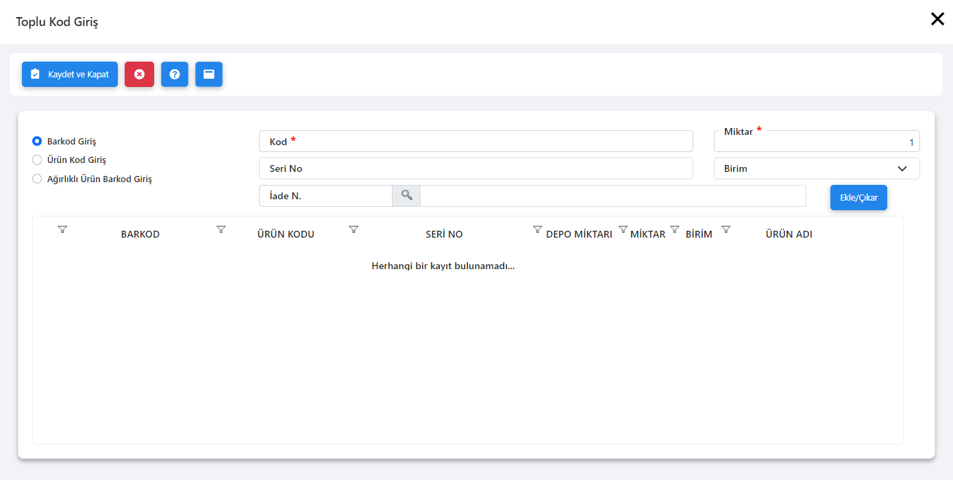 Toplu Kod Girişi detayına eklenen ürünün belge detayına eklenmesi için Kaydet Ve Kapat butonuna tıklanır. |