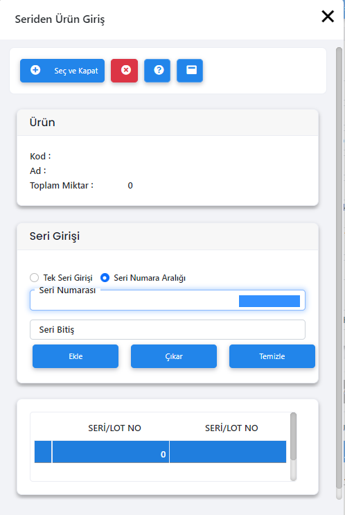 Seriler detaya girildikten sonra Seç Kapat butonuna bastığımızda serilere ait bulunan ürünler belge detayına eklenir. |