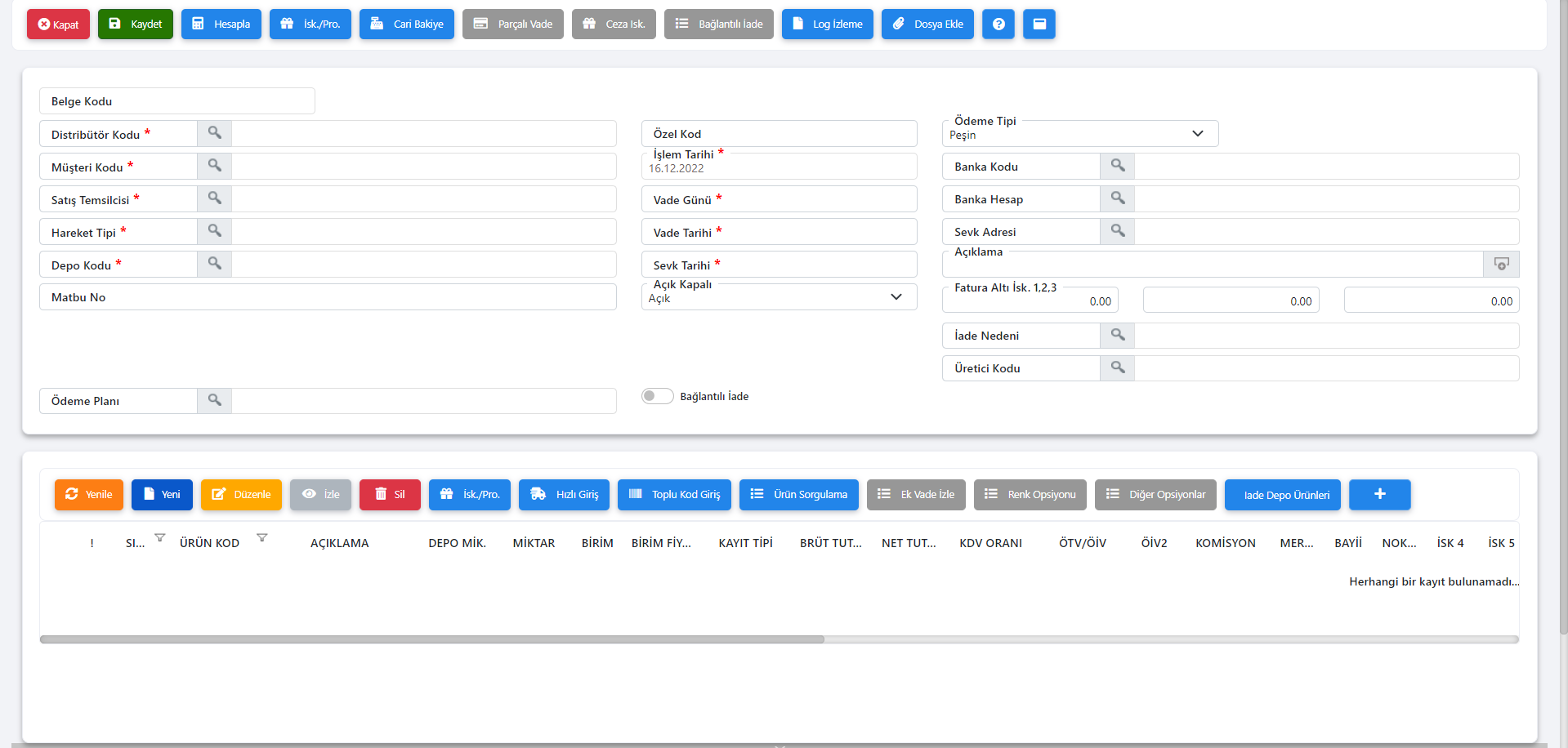 İsteğe bağlı olarak dip toplamda yapılacak iskontoların girildiği alanlardır. Buraya girilen iskontolar satırlara dağıtılabilir. |