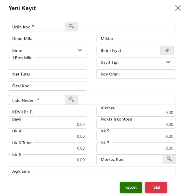 İade alınan ürünün hangi depoya alınacağı bu alandan seçilir. Default olarak distribütörün varsayılan deposu gelir fakat değiştirilebilir. Zorunlu bir alandır. |