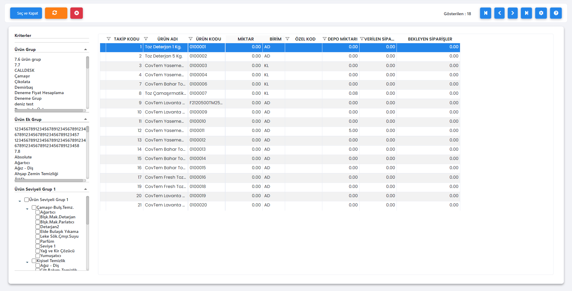 Hızlı giriş ürün listesinde, Ürün Grup seçimi yapılarak sadece seçilen ürün gruplarına bağlı ürünlerin listelenmesi için kullanılır. |
