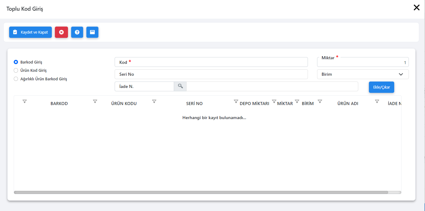 Toplu Kod Girişi detayına eklenen ürünün belge detayına eklenmesi için Kaydet Ve Kapat butonuna tıklanır. |