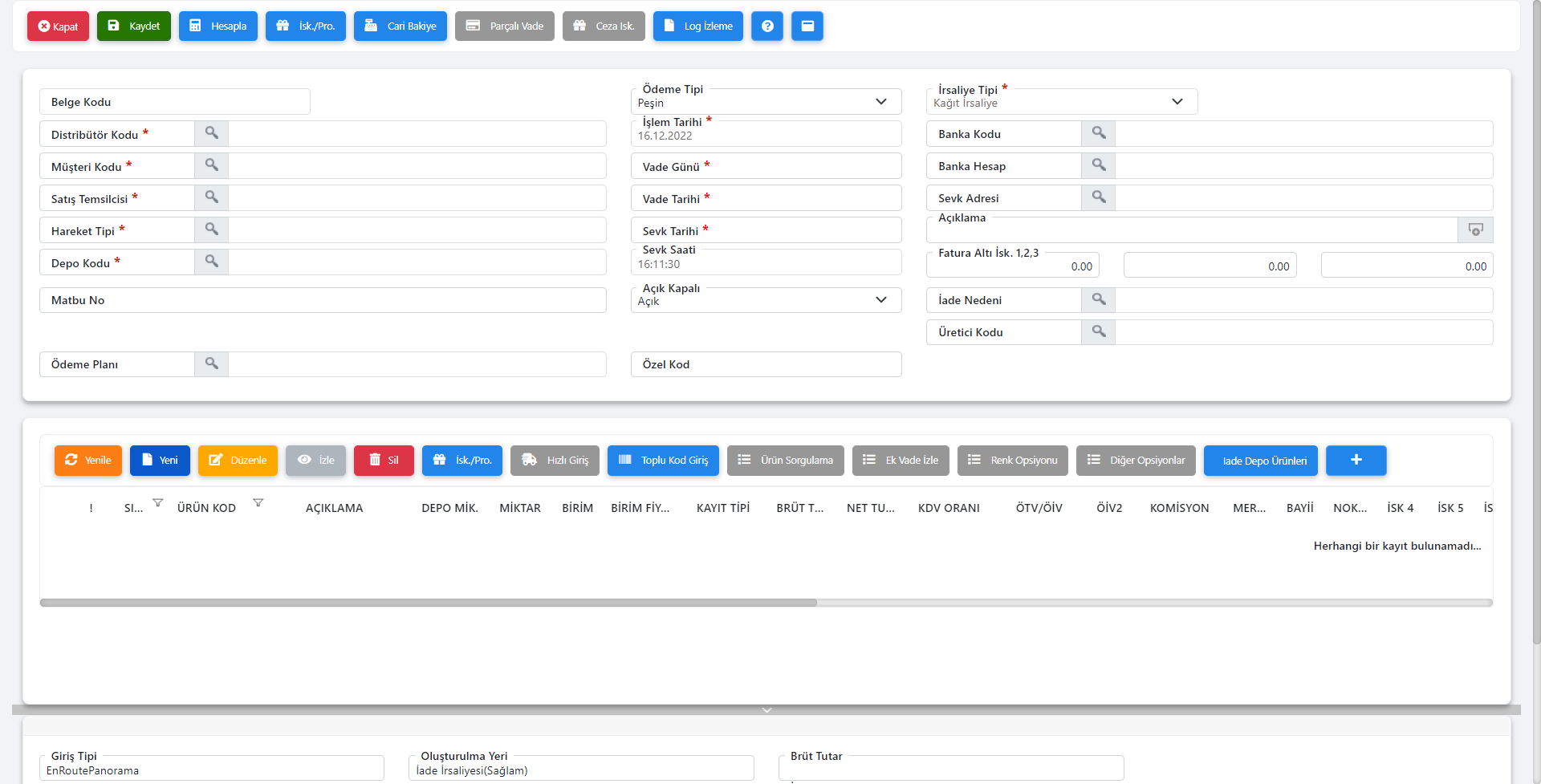 İade alınan ürünün hangi depoya alınacağı bu alandan seçilir. Default olarak distribütörün varsayılan deposu gelir fakat değiştirilebilir. Zorunlu bir alandır. |