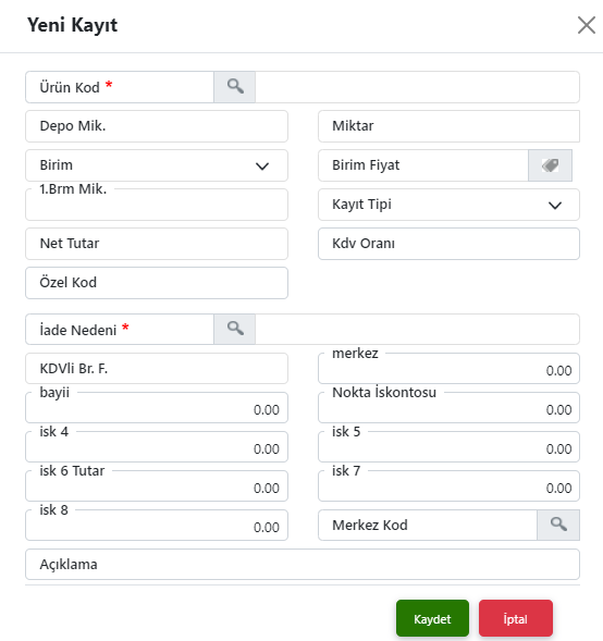 Seçilen Ürün için iade neden seçimi bu alandan yapılır. Parametrik olarak belge başlıkta veya detayda iade nedeni girilir. |