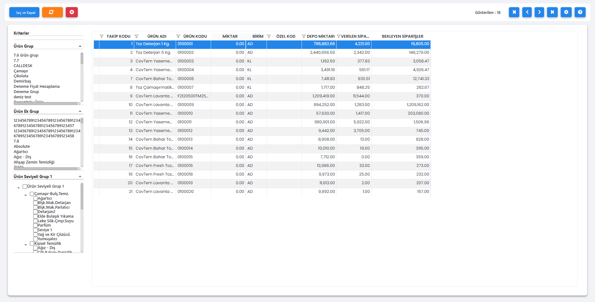 Hızlı giriş ürün listesinde, Ürün Grup seçimi yapılarak sadece seçilen ürün gruplarına bağlı ürünlerin listelenmesi için kullanılır. |