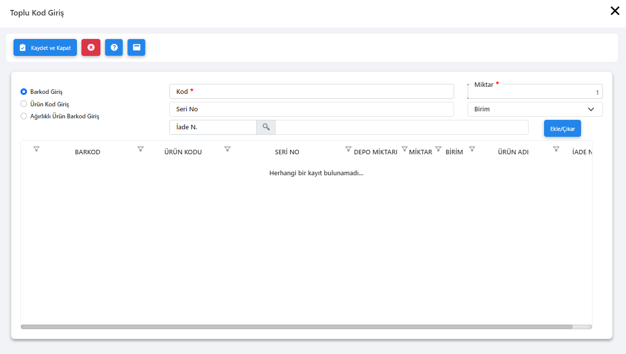 Toplu Kod Girişi detayına eklenen ürünün belge detayına eklenmesi için Kaydet Ve Kapat butonuna tıklanır. |