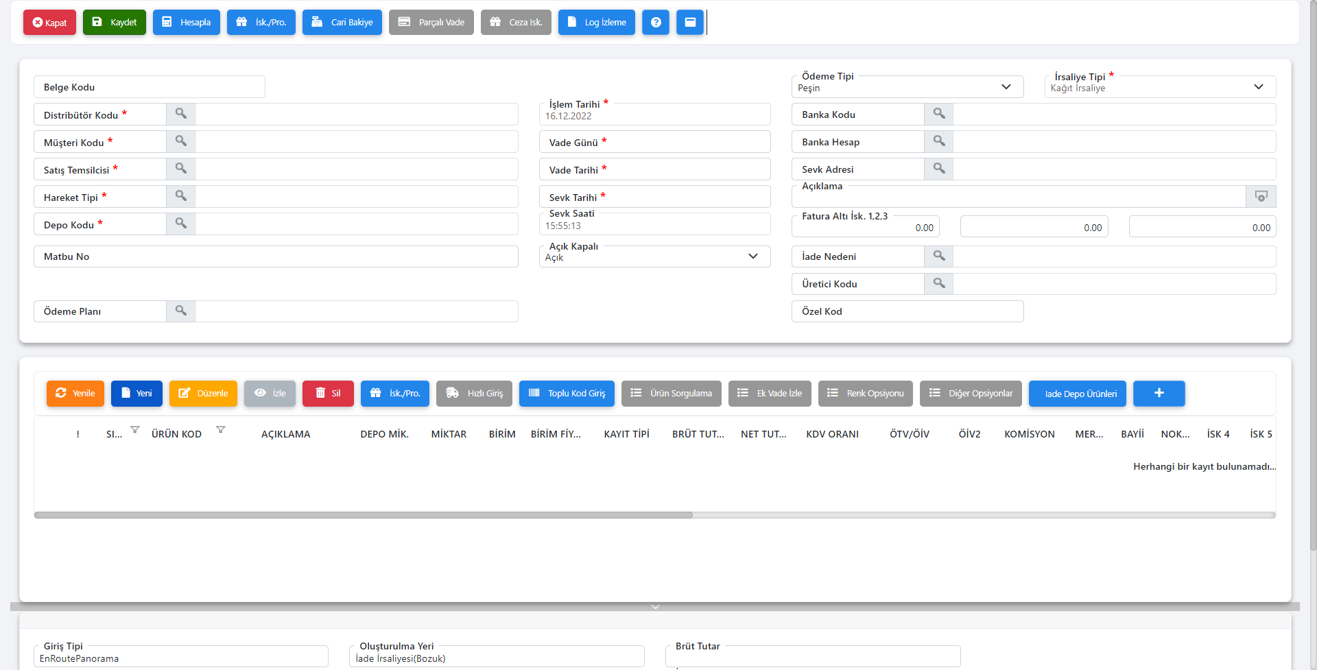İade alınan ürünün hangi depoya alınacağı bu alandan seçilir. Default olarak distribütörün varsayılan deposu gelir fakat değiştirilebilir. Zorunlu bir alandır. |