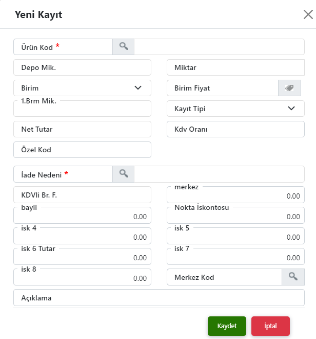 Seçilen Ürün için iade neden seçimi bu alandan yapılır. Parametrik olarak belge başlıkta veya detayda iade nedeni girilir. |