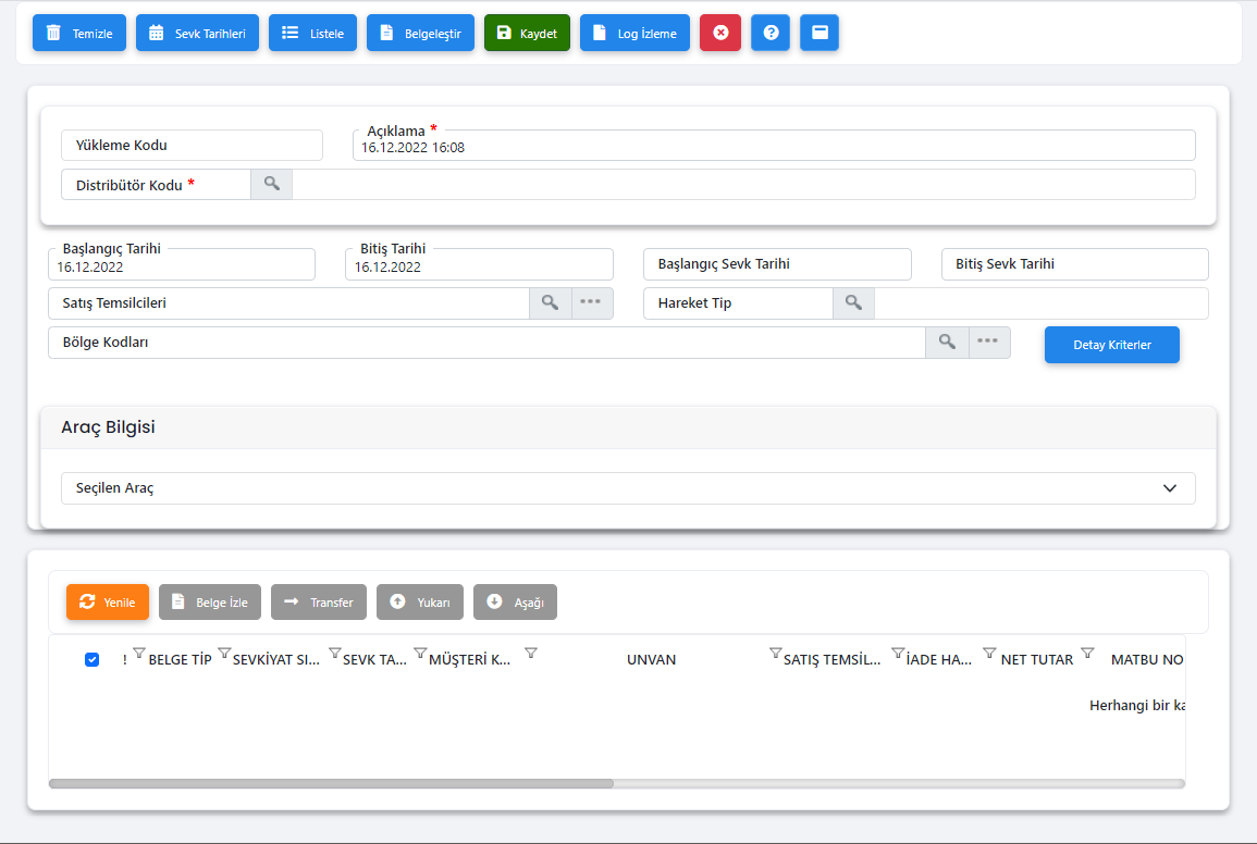 İrsaliyelerin yükleme yapılacağı araç seçilir. |