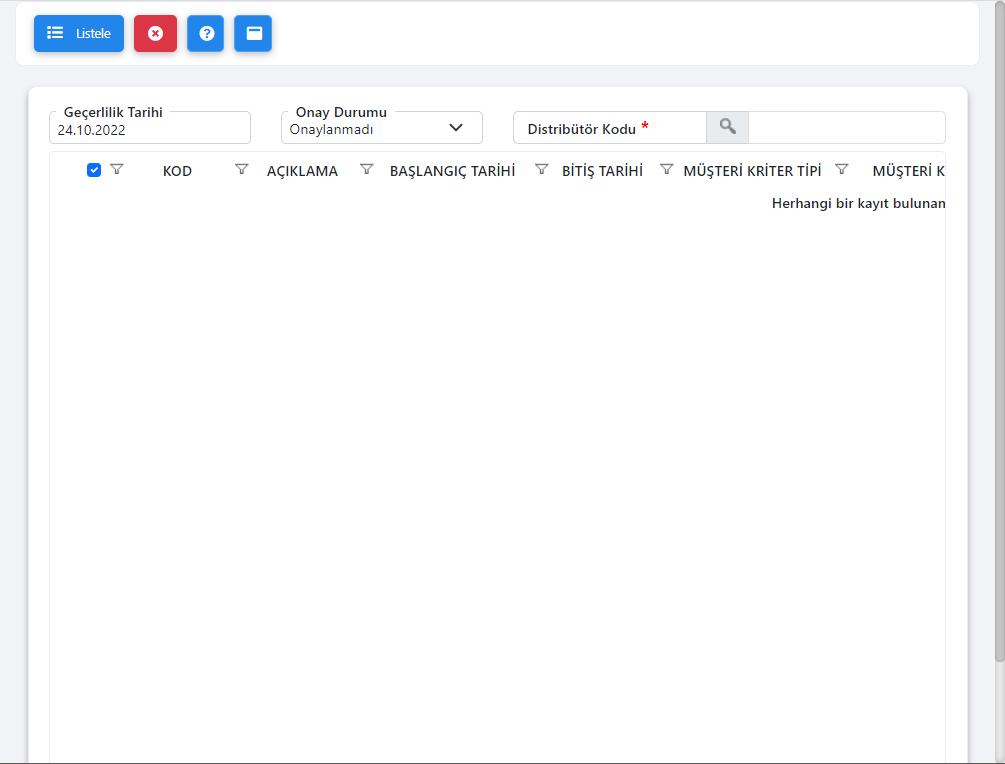 Onaylanacak iskonto tanımlarının ait olduğu distribütör seçimi yapılır. |