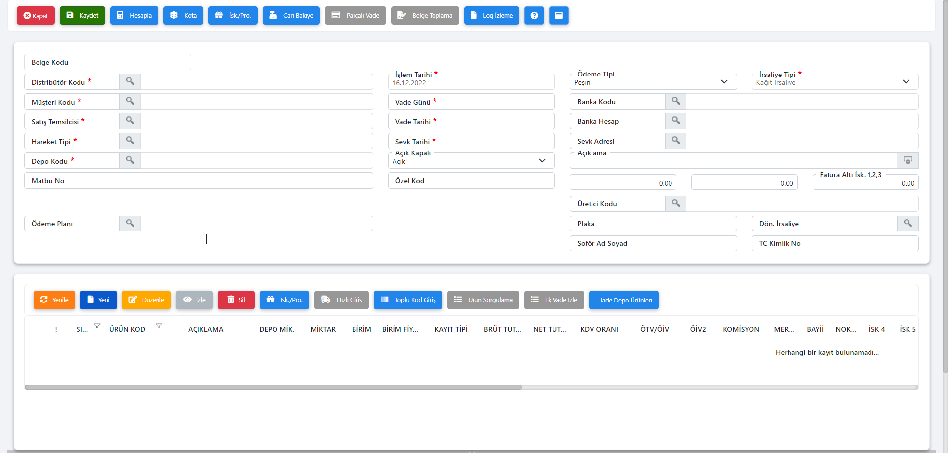 Sevkiyat deposunun seçildiği alandır. Default olarak distribütörün varsayılan deposu gelir fakat değiştirilebilir. Zorunlu bir alandır. |