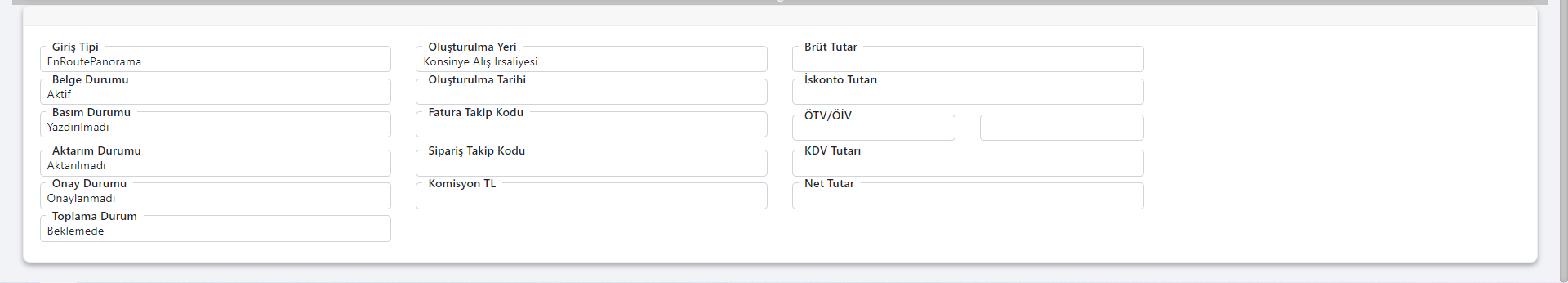Belgenin nereden girilmiş olduğunu belirtir. Panoramadan girilen belgeler için giriş tipi EnroutePanorama, Mobilden girilen belgelerin giriş tipi PanoramaMobile, Ticari Paket aktarımı ile gelen belgelerin giriş tipi Panorama Aktarım olarak görünür. |