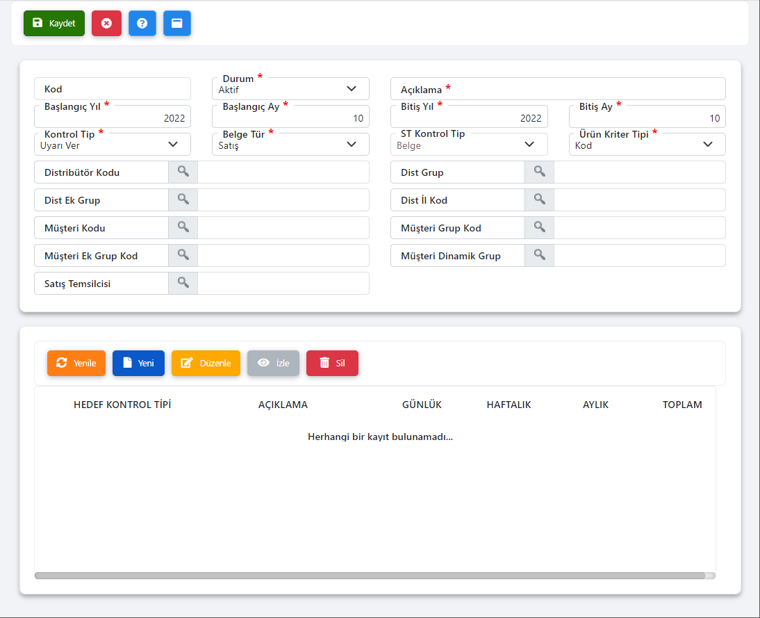Menü Adımı : Satış ve Pazarlama Kriteri --> Satış Kriterleri --> Kota Şablon
