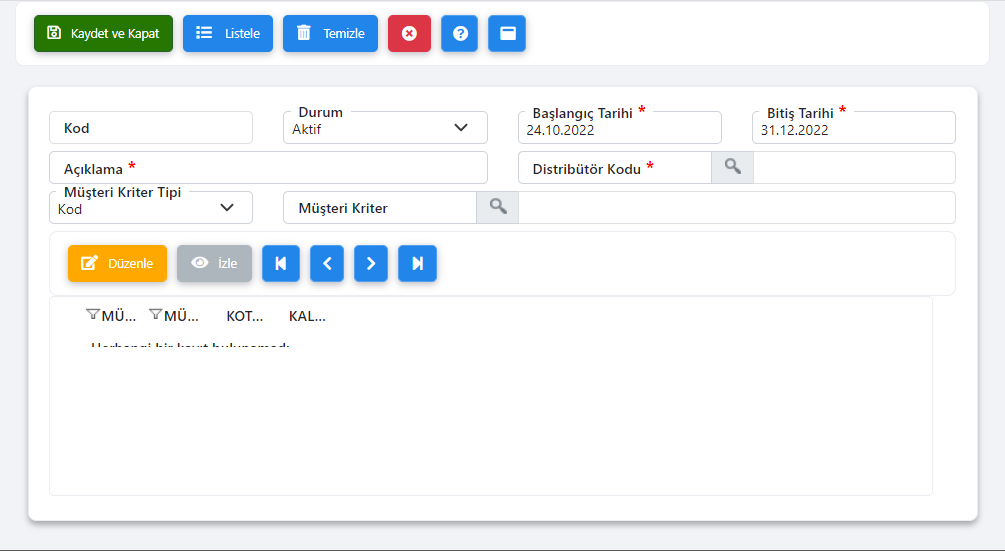 Listelenen müşteri kaydı seçilerek Düzenle butonu ile bütçe değeri girilir. |
