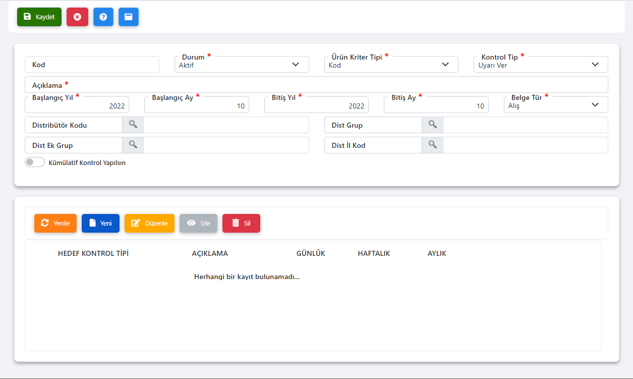 Menü Adımı : Satış ve Pazarlama Kriteri --> Satış Kriterleri --> Kota (Distribütör)