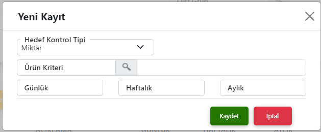 Hedef tip miktar ya da tutar şeklinde seçilebilir. Miktar seçildiği zaman belirlenen ürün miktarı üzerinden limitleme yapılır. Tutar seçildiği zaman belirlenen ürünün tutarı üzerinden limitleme yapılır. |