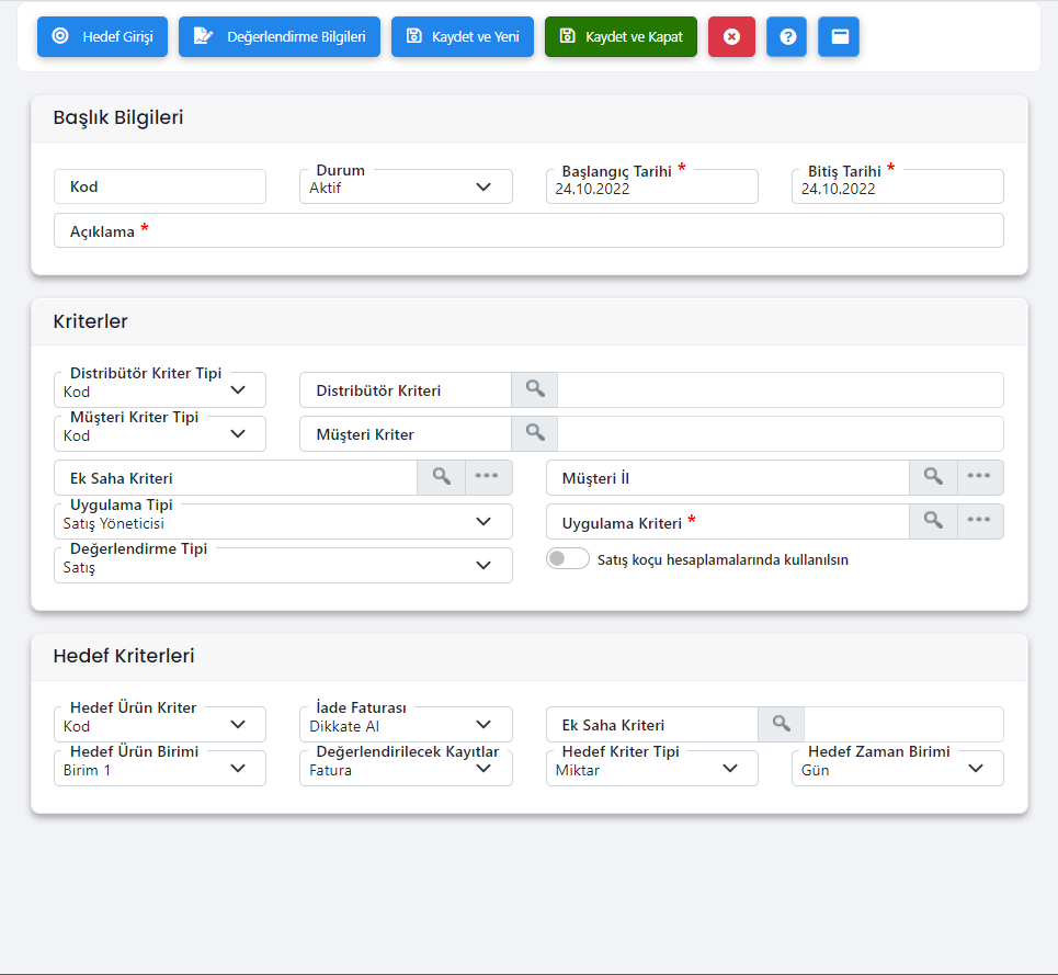 Seçilecek hedefin tipi belirlenir, miktar/tutar/ağırlık/hacim/litre/SKU çeşidi değerlerini alır. |