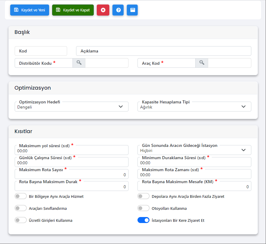Ekran Tanımı : Rut optimizasyon parametreleri ekranıdır.