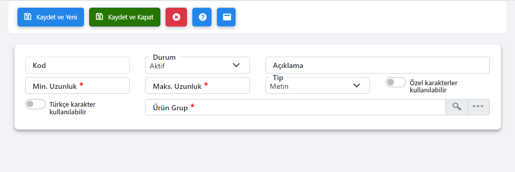 Özel Karakterler Kullanılabilir parametresi seçilir ise seri girişinde özel karakter girilebilir. Tip Değeri Metin seçilmesi durumunda bu parametre seçilebilir. |
