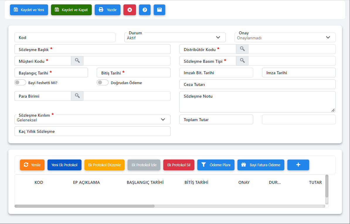 STANT SÖZLEŞME TANIMLAMA EKRANI