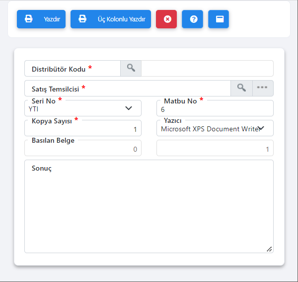Basımı yapılacak belgelerin bağlı olduğu distribütör seçimi bu alandan yapılır. |