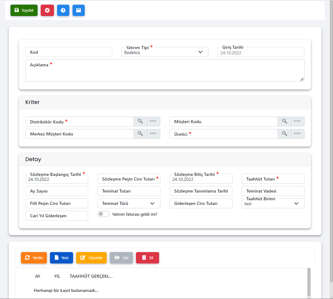 Ekran Tanımı : Yatırım bilgilerinin tanımlandığı ekrandır.